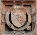 Arms of Wynard: Argent, on a bend azure three mullets of the first,[15] ), exterior wall of Wynard's Hospital, Exeter