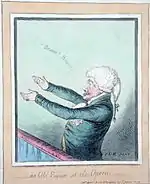 Galloway, a frequent opera-goer, was caricatured by James Gillray in An Old Encore at the Opera! of 1803.[2] In 1762, James Boswell wrote of him that he had "a petulant forwardness that cannot fail to disgust people of sense and delicacy".[5]