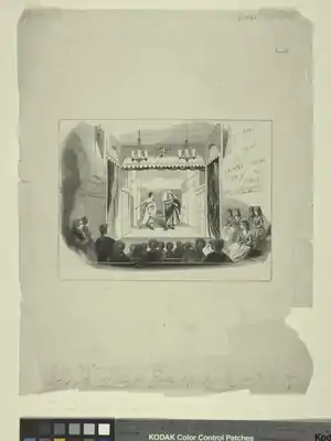The John Street Theatre was modelled after Douglass's own Southwark Theatre in Philadelphia, the first permanent theatre in the United States,[2] which was itself modelled on the theatres of London.[4] No pictures survive of the building's exterior.[5] Dunlap described it as "principally of wood, an unsightly object, painted red". It was set 60 feet back from the street, with a wooden covered walkway from the pavement to the doors.[2][6] Inside, it had two tiers of boxes, a pit and a gallery. The dressing rooms and green room were located in a neighbouring shed,[5] although Dunlap speculates that these were originally under the stage.[6] Its seating capacity was approximately 750.[7]