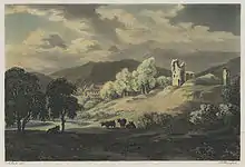 Other books illustrated with engravings after works by Smith include Select Views in Italy (1792–6); Views of the Lakes of Cumberland, with twenty aquatints by James Merigot (1791–5); William Byrne's Britannia Depicta and William Sotheby's Tour through Wales (1794).[2] This last book was subtitled "Odes and other Poems. With Engravings from Drawings taken on the Spot by J. Smith". In the preface, Sotheby wrote "the author of the following Poems thinks proper to signify, that the present edition is published solely for the emolument of the artist, who has stamped a value on the descriptive parts of the Welsh Tour, by the embellishments of his accurate and masterly pencil". The plates were etched in aquatint by Samuel Alken.[7]