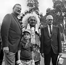 Wayne supported Vice President Richard Nixon in the presidential election of 1960, but expressed his vision of patriotism when John F. Kennedy won the election: "I didn't vote for him, but he's my president, and I hope he does a good job."[106] He used his star power to support conservative causes, including rallying support for the Vietnam War by producing, co-directing, and starring in the financially successful film The Green Berets (1968).[107] In 1960, he joined the anti-communist John Birch Society, but quit after the organization denounced fluoridation of water supplies as a communist plot.[108] In 1964, Wayne was a staunch supporter of Barry Goldwater, and actively campaigned for him.[109]
