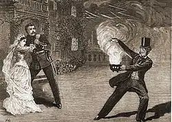 The Sorcerer opened on 17 November 1877 at the Opera Comique, preceded by Dora's Dream, a curtain-raiser composed by Sullivan's assistant Alfred Cellier, with words by Arthur Cecil, a friend of both Gilbert's and Sullivan's.[29] Busy with last-minute cuts and changes the day before the show opened, Sullivan had no time to write an overture and used the "Graceful Dance" music from his incidental music to Henry VIII, together with a few measures of music from "Oh Marvellous Illusion", as an overture. For the 1884 revival, an overture was composed by Sullivan's assistant, Hamilton Clarke.[29] Gilbert's meticulous rehearsal of the cast was noticed and commented on favourably by the critics, and the opening-night audience was enthusiastic.[31] The Sorcerer ran for 178 performances, making a profit.[32] A touring company also began playing the opera in March 1878.[33] D'Oyly Carte continued touring the piece in the early 1880s.[34] Unauthorised productions played on Broadway and elsewhere in the U.S. beginning by 1879.[35][36] The original London sets were by W. Beverly, and costumes were by C. Wilhelm.[37]