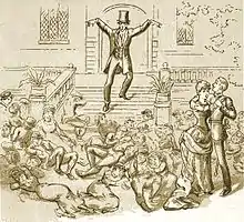 The satire in the opera is focused on old-fashioned customs, pastoral opera conventions, the "popularity of curates, the pose of aristocratic benevolence, and the inebriety of the working man" rather than the broad political satire that would feature in many of the later Savoy opera librettos.[74] For example, "Sir Marmaduke, my dear young friend Alexis", a recitative among Alexis, Sir Marmaduke and Dr Daly, is a skit on the excessive politeness associated with early nineteenth-century aristocracy,[75] and the incantation scene is a parody of the similar scene in Weber's Der Freischütz.[76] Dr Daly accompanies his Act II song on a flageolet.[77] Gilbert satirises the Victorian temperance movement by introducing a non-alcoholic brindisi with jorums of tea; this is also a dig at Italian operas, many of which contained a brindisi scene.[78] Another burlesque of Italian opera is "Prepare for sad surprises", which is similar to Alfredo's denunciation of Violetta in Verdi's La traviata.[59] Gilbert's satire of these subjects, like most of his satire in the operas, was blunted with gentle humour. As Gilbert scholar Andrew Crowther explains, Gilbert characteristically combines his criticisms with comic entertainment, which renders them more palatable, while at the same time underlining their truth: "By laughing at a joke you show that you accept its premise."[79] Theatrical critic Allardyce Nicoll compared J. W. Wells' speech about blessings being less popular than curses to Mr. Hen's satiric auction speech in The Historical Register for the Year 1736 by Henry Fielding.[80]