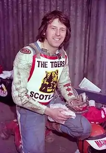 John graduated to Speedway from Grasstrack racing. After some brief appearances with Sunderland Stars in 1971, he rode for the Glasgow Tigers speedway team from 1971 to 1977 (Relocated as Coatbridge Tigers from 1974[1]) and appeared for the Scotland national team from 1973 through to 1975.[2] John also rode in four indoor Ice speedway events in Scotland during 1972 including the first event at Murrayfield riding for "Ayr Giants" against "Murrayfield" and the Scottish Open Pairs event in Aviemore, riding for Wembley Lions with partner Bert Harkins.[3] John rode three Long Track Speedway events at Motherwell finishing with a respectable 8 points in the opening event.[4]