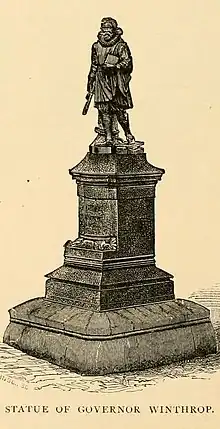 Winthrop accompanied the ill-fated expedition of the Duke of Buckingham for the relief of the Protestants of La Rochelle in France, and then travelled in Italy and the Levant, returning to England in 1629.[2] In 1631, he followed his father to Massachusetts Bay Colony and was one of the assistants of the Colony in 1635, 1640, and 1641 and from 1644 to 1649.[2] He was the chief founder of Agawam (now Ipswich, Massachusetts) in 1633, then went to England in 1634. He returned in 1635 as governor of lands that had been granted to Lord Say and Sele and Lord Brooke, and he sent out a party to build a fort named Saybrook in their honor, located at the mouth of the Connecticut River. He then lived for a time in Massachusetts, where he devoted himself to the study of science and attempted to interest the settlers in the development of the colony's mineral resources.[2]