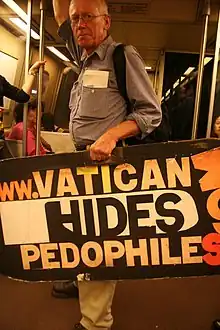 John Wojnowski (born 1943 in Warsaw, Poland) is an anti-pedophile activist who has maintained a one-man protest outside the Apostolic Nunciature in Washington D.C. since 1998. Wojnowski, a retired ironworker, stands on Massachusetts Avenue during afternoon rush hour holding signs with slogans such as "My Life Was Ruined by a Catholic Pedophile Priest" and "Pedophilia: Catholic Clergy's Sordid 'Professional Secret'".[1][2]