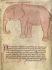 Amongst a miscellany of items, including an outline chronicle for a history of Britain,[3] and a tide table for predicting "flod at London brigge" (i.e. the time of high tide at London Bridge),[4] that is credited with being the earliest extant such tide table in Europe,[5] other items in the manuscript include a drawing of Wallingford by Paris, a draft for a map of Britain by Paris to which Wallingford has added some further place-names, and a copy by Wallingford of Matthew Paris's picture of King Henry III's elephant.