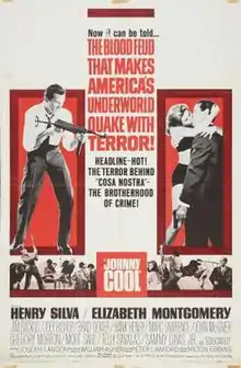 Johnny Cool is a 1963 American neo-noir[2] crime film, directed by William Asher and based on the novel The Kingdom of Johnny Cool by John McPartland, which stars Henry Silva and Elizabeth Montgomery.[3] Produced in part by Peter Lawford, Johnny Cool features a cast that also includes Mort Sahl, Telly Savalas, Jim Backus, Joey Bishop, and Sammy Davis Jr., who also sings the theme song.