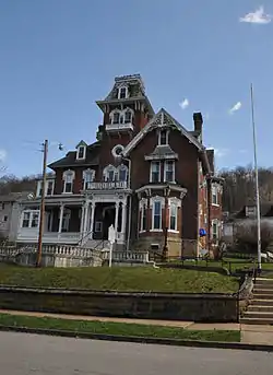 Jonathan M. Bennett House, also known as Louis Bennett Public Library, is a historic home located at Weston, Lewis County, West Virginia. Its name reflects its builder, Jonathan M. Bennett, who represented Lewis County in the Virginia General Assembly and served as state auditor before the American Civil War. Bennett was a prominent local lawyer and businessman, who was allowed to hold office in West Virginia following its adoption of a new state Constitution in 1872.[2] He built this house in 1874–1875; the 17-room mansion reflects the High Victorian Italianate style. It features a 4+1⁄2-story entrance tower with a mansard roof. It also has heavy wooden brackets on the tower and verandah, a balustraded tower balcony, and an elaborate bargeboard. it was left by Mrs. Louis Bennett, Sr., in 1922 to the citizens of Lewis County as a public library and community center.[3]