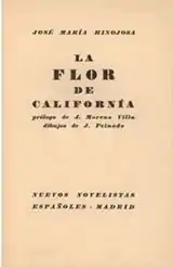 Two volumes from 1928 are thought to be the most mature of Hinojosa's works. Orillas de la luz[66] contained mostly poems saturated with eroticism, its main theme.[67] They were, to a large extent, within the surrealist framework, featuring its trademark motives like mutilations and fragmented body parts; the fact that this poetry retained classic metrum is thought to be demonstrative of Hinojosa's synthetic ambitions.[68] La Flor de Californía,[69] considered the first surrealist work in Spain,[70] is his sole prosaic volume; it contains seven dream narratives and seven oneiric texts; the former retain some bizarre linear coherence, while the latter come close to so-called automatic writing.[71] The prose explores typical surrealist imagery:[72] antireligious motives,[73] black humor, objective chance and subterranean dream-worlds, containing also a series of apocalyptic visions.[74] Strictly auto-biographical in terms of perspective, it is viewed as an expression of his own identity in an increasingly desperate pursuit of fulfillment.[75] La Sangre en Libertad (1931)[76] was very much a repetition of La Flor but brought to extremes, with new levels of anti-religious ridicule,[77] sexual references, motives of violence and apocalyptic scenery.[78] Autobiographic features were embroiled in catastrophic premonitions;[79] stylistically the volume shows an evolution towards free verse[80] and far-reaching formal linguistic experiments.[81]