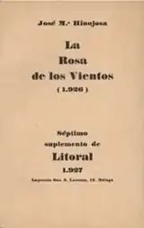 Early poems, from these printed in Ambos to Poema del Campo (1925),[56] are anchored in rural myths and set in capacity perceptive of an unspecified territory, largely bucolic and lyrical. In terms of style due to folk ambience some refer to "neopopulism",[57] others mention also "purismo" and "cubismo".[58] Scholars flag a synthesis of tradition and modernity, the latter represented by innovative if not already extravagant metaphor.[59] Poesía de perfil (1926),[60] published in Paris,[61] offered poems inspecting an interior of the fantastic mixed with a real setting. The largely descriptive tone gave way to dominant lyrical expression and the monothematic perspective was replaced with a variety of themes, often organized around the motive of exploration. "Estética purista" was partially substituted by oneiric and surrealist approach, not clear yet already visible, and the entire volume was distinctively more expressive.[62] La Rosa de los Vientos (1927),[63] published again in Málaga, was a small collection of just 19 poems; they focused upon imaginary journeys to exotic locations[64] and to the inner self. Providing a discourse on space, mystery, and wilderness the volume offered frequent references to ancient as well as popular culture and introduced heterodox erotic motives. Stylistically at times very sophisticated, blending various rhyme orders and syllable types, it is described as a mix of Hispanic Ultra, French surrealism and Chilean creationism.[65]