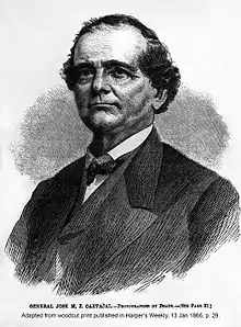 Juarez enlisted Carbajal as general of the Liberal forces.[96] On November 12, 1864, Juarez authorized Carbajal to enlist upwards of ten thousand foreign citizens.[97] Juan Cortina had been in control of Matamoros, and surrendered the city to the French, under the control of Tomas Mejia.[98] President Abraham Lincoln and Secretary of War Edwin M. Stanton sent General Lew Wallace on a covert operation to assist Carbajal in procurement of arms and ammunition.[99][100] In 1866, Napoleon III withdrew his troops from Mexico.[101][102] Mejia surrendered Matamoros to Carbajal, who was by then Governor and Military Commandant of Tamaulipas.[103] Seizures of churches from French clerics, and forced loans from French-leaning merchants were part of Carbajal's operations.[104] Sebastián Lerdo de Tejada appointed Santiago Tapia[105] to replace Carbajal. The military garrison of Matamoros also rebelled against Carbajal.[106]