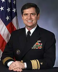 Graduating second in his class at the United States Naval Academy, Sestak served in the United States Navy for over 31 years and rose to the rank of three-star admiral.[6] He served as the Director for Defense Policy on the National Security Council staff under President Bill Clinton and held a series of operational commands, including commanding the USS George Washington carrier strike group during combat operations in the Persian Gulf and Indian Ocean in 2002.[7]