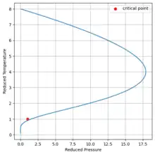 For the Dieterici gas, the reduced inversion temperature is , and the relation between reduced pressure and reduced inversion temperature is . This is plotted on the right. The critical point falls inside the region where the gas cools on expansion. The outside region is where the gas warms on expansion.[9]