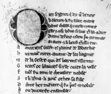 The importance given to loyalty in Jordain suggests that it originated in and for a feudal aristocratic milieu.[11] It survives in a single manuscript, now BnF fr. 860, at folios 111v–133v, with decorated initials and "beautifully executed" handwriting.[12] It was probably written in the late 12th or early 13th century not long before the manuscript was copied in the first half of the 13th century.[13][4]