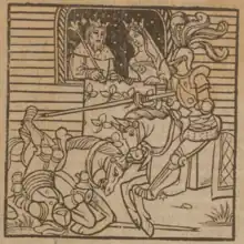 When Jordain inadvertently anchors in a port held by Saracen pirates, a sea battle ensues. He is captured, but his men rescue him. Renier, meanwhile, has obtained his freedom from Salatien. Neither recognises the other as they approach each other on the road. Only their respective battle cries, "Blaivies!" and "Valtamise!", avert a disaster. Jordain, Renier and Oriabel return to Orimonde to collect Gaudisce. King Cemayre's wife, however, has had her carted off to Constantinople and abandoned because she was more beautiful than her own daughter. In Orimonde, the queen tells to Jordain that his daughter is dead, but Gaudisce's former guardian, Josselme, admits the truth.[20]