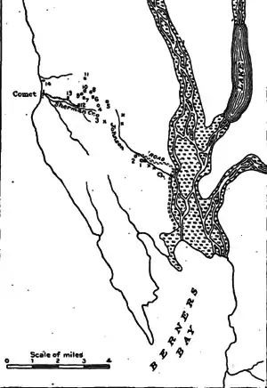 Jualin Mine is a defunct gold mine located within the City and Borough of Juneau, Alaska approximately 44 miles (71 km) northwest of downtown Juneau, Alaska. The Jualin gold deposit was discovered by prospector Frank Cook in 1895 and was initially mined by the Jualin Mining Company. A stamping mill with a daily capacity of 30 stone (0.19 t) of ore was installed early in the mine's operation. The mine operated intermittently from 1896 to 1901 and again from 1905 to 1908, when it was closed at a depth of 210 feet due to water infiltration and power shortages. In 1912, the mine was purchased by a Belgian group, which began investing in better equipment and deeper drilling. In 1914, the shaft was deepened to 325 feet, and mining took place at the 310-foot level. A drainage and haulage tunnel was planned to extend 7,800 feet (2,400 m) south of the mine to allow easy access to the mining levels, but the outbreak of World War I halted this effort when the extension was only 5,000 feet (1,500 m) long.[1]