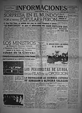 In the late 1940s Sáenz-Díez remained member of the rather inactive Carlist leadership, in 1947 nominated to the first post-war Consejo Nacional[84] and taking part in meager party initiatives, also abroad.[85] When in the early 1950s Manuel Fal commenced a project of launching a semi-official national Carlist daily, due to his business position Sáenz-Díez was entrusted with bringing it to a successful end. Since 1951 he set sights on Informaciones, an ailing Madrid commercial newspaper;[86] following some legal and financial maneuvering, in 1953 he purchased the daily.[87] Formally his private property, it was left at disposal of Comunión Tradicionalista[88] and pursued its editorial line.[89] Sáenz-Díez entered Consejo de Administración and brought new staff to the newspaper, transferring his old collaborator Goñi Aizpurúa from El Correo Gallego and attracting other professionals.[90]