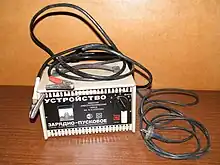 A hand-portable battery, equipped with attached cables and charger, can be used similarly to another vehicle's battery. A self-contained jump box contains a battery and connects directly to the battery of the engine that needs a boost. Portable boosters may automatically sense the battery's polarity prior to sending power to the vehicle, eliminating the damage that can result from reversing the connection.[6] There are various portable jump starters that are multi-functional and can be used to charge other electronic devices as well.[7]