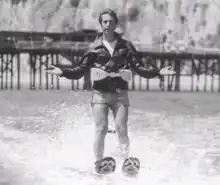 Fonzie (Henry Winkler) on water skis, in a scene from the 1977 Happy Days episode "Hollywood, Part 3", after jumping over a shark
