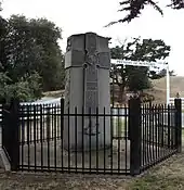 On Pentecost Sunday, June 3, 1770, Serra, Portolá and the whole expedition held a ceremony at a makeshift chapel erected next to a massive oak tree by Monterey Bay, to found mission San Carlos Borromeo. "The men of the land and sea expeditions coming from different directions met here at the same time," wrote Serra, "we singing the divine praises in our launch, while the gentlemen on land sang in their hearts." After the raising and planting of a large cross, which Serra blessed, "the standards of our Catholic monarch were also set up, the one ceremony ... accompanied by shouts of 'Long live the Faith!' and the other by 'Long live the King!' Added to this was the clangor of the bells, the volleys of the muskets, and the cannonading from the ship."[88] Both king Carlos III and viceroy Carlos de Croix had chosen to name the new mission after Carlo Borromeo.[89] The body of a sailor, Alexo Niño, who had died the day before aboard the San Antonio, was buried at the foot of the newly erected cross.[90]