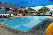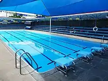 The swimming pool complex includes two rectangular, in-ground, concrete swimming pools and timber stands. The 1929 pool has slightly rounded corners. The complex is enclosed by early face brick and perforated concrete block walls to the south and east, a corrugated metal-clad timber-framed fence to the north, and a recent, face brick, changing room structure (2003, not significant) to the west. The oldest and smallest pool is the 1910 swimming pool, which runs on a north–south axis, measures 13 by 4.9 metres (43 ft × 16 ft), and is located west of the perpendicular, 1929 swimming pool, which measures 23 by 7.6 metres (75 ft × 25 ft). Both pools have tiled edges and concrete pavers around them. The stands comprise tiered, timber-framed seating that allow for the viewing of the 1929 swimming pool. The stands are sheltered by a metal-framed roof (1989) that is not of cultural heritage significance.[1]