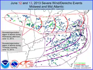 The derecho continued eastward into the early morning hours of the 13th, through Pennsylvania, Virginia, West Virginia, Maryland, New Jersey, and Delaware, producing wind damage in each state before dissipating.[9]