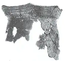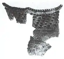 Eleven sherds representing a single vessel were present at Juntunen.[4] Ramey Incised is a Middle Mississippian pottery type first identified at the Cahokia Old Village site in southern Illinois. It has also been recovered at Carcajou Point in Wisconsin, but its presence at Juntunen marks the northernmost occurrence of any Middle Mississippian pottery type. Tempering is shell-tempered mixed with grit and decoration is a distinctive pattern of curvilinear designs. The vessel shape is thought to be a bowl with sharply defined shoulder. It was recovered in intermediate strata between the Bois Blanc and Juntunen Phases.[4][13]