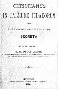 Justinas Bonaventura Pranaitis or Pronaitis[1] (Russian: Иустин Бонавенту́ра Пранайтис; 27 July 1861 – 28 January 1917[2]) was a Lithuanian Catholic priest and Professor of Hebrew at the St. Petersburg Roman Catholic Theological Academy. He is best known as the author of the antisemitic text The Talmud Unmasked, and his subsequent involvement in the Bellis trial.