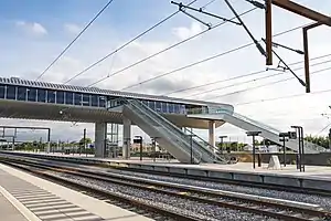 The six platforms are built on each side of an eight-lane motorway (two S-train platforms to the east; the main line platforms to the west) and are connected by a 225-metre pedestrian bridge.[6][7] The high-speed line between Ny Ellebjerg and Ringsted is now completed,[8] but adjustments are needed at Ringsted station before trains can start running at 250 km/h.[9] S-trains and a limited regional service began using Køge Nord the day after its inauguration.[10] Intercity services started in December 2019.[11]