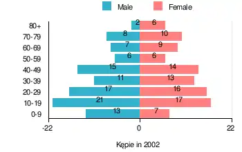 According to the 2002 Poland census, there were 198 people residing in Kępie village, of whom 50.5% were male and 49.5% were female. In the village, the population was spread out, with 27.8% under the age of 18, 37.9% from 18 to 44, 15.7% from 45 to 64, and 18.7% who were 65 years of age or older.[1]