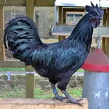 Kadaknath, also called Kali Masi ("fowl having black flesh"), is an Indian breed of chicken. They originated from Dhar and Jhabua, Madhya Pradesh. These birds are mostly bred by the rural and tribals.[1] There are three varieties: jet black, golden and pencilled.[2] The meat from this breed has a geographical indication (GI Tag) tag that was approved by the Indian government on 30 July 2018.[3]