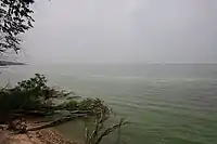The reservoir covers a total area of 2,155 km2 (832 sq mi) in the Kherson, Zaporizhzhia, and Dnipropetrovsk Oblasts of Ukraine.[2] It is 240 km (150 mi) long and up to 23 km (14 mi) wide. The depth varies from 3 to 26 m (9.8 to 85.3 ft; 1.6 to 14.2 fathoms) and averages 8.4 m (28 ft; 4.6 fathoms). The total water volume is 18.2 km3 (4.4 cu mi). The Kakhovka dam has resulted in the natural water level of the Dnieper River being raised 16 m (52 ft).[3] Locals sometimes referred to the reservoir as the Kakhovka Sea as the other side of the river bank could not be seen at some points.[4]