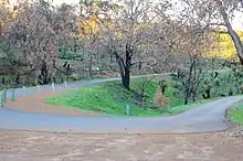 The Kalamunda Zig Zag was completed in July 1891, as part of the Upper Darling Range Railway line in Western Australia which was built by the Canning Jarrah Timber Company from a junction with the Midland line at Midland Junction to Canning Mills to transport railway sleepers to Perth's growing railway system. On 1 July 1903, the line was taken over by the Western Australian Government Railways.[2][3] To overcome a steep gradient up the Darling Scarp, a zig zag was built between Ridge Hill and Gooseberry Hill stations, being cheaper to build than a continuous gradient line. The Kalamunda Zig Zag closed on 22 July 1949 along with the rest of the line. In 1952 the track was removed and most of the Kalamunda Zig Zag converted into a narrow bitumen road.