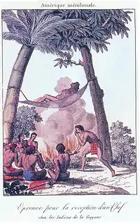They were prolific travelers even though they weren't nomads. They often traveled by land and by sea as far as the area around the Orinoco river to visit family, trade, and marry.[13] They often went to the area surrounding the Essequibo river (now in Guyana) to collect pebbles of red porphyry (takuwa), which Kali'na women prized for polishing their pottery.[14] The term takuwa also refers to jade, which was often traded in the Americas in general.[15]