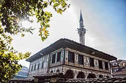 The Alim Bey House is an historic estate in Tetovo. Along with the Saraj in Resen, it is among the more prominent examples of lodgings built by wealthy Ottoman pashas and beys in North Macedonia that were constructed in Western-inspired architecture. The Alim Bey House is an asymmetrical estate built in the neo-Baroque style with decorated façades, ornate friezes, and the use of various geometric shapes including a hexagonal tower. The three-story home is a protected monument of cultural heritage.[41] The building functioned as a hospital until 1993. Renovation works funded by Ministry of Culture of the Republic of Macedonia occurred in 2016.[42]