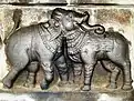 There is a separate shrine for the deity Sarabeswarar,[11] a fusion of man, eagle and lion, who is believed to have relieved the devas (celestial deities) from the fury of Vishnu in the form of Narasimha after he slayed Hiranyakasipu.[5] Sharbeshwaramurti is depicted with six legs, the body and face of a lion, and a tail. It has four human arms, with an axe held in the right upper hand, a noose in the lower right hand, a deer in the upper left hand, and fire in the lower left hand. Narasimha is shown with eight arms, flailing and struggling under Sharbeshwaramurti's feet.[12] The shrine also has sculptures of Sridevi and Bhudevi, the consorts of Vishnu.[5] The bronze image of Sarabheswara temple is believed to be from the period of Kulothunga Chola III.[13]