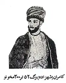 Kamran Shah Durrani was born in the Sadozai dynasty. He was the son of Mahmud Shah Durrani, grandson of Timur Shah Durrani[2] and the great grandson of Ahmad Shah Durrani,[3] the founder of the Durrani Empire. He was deposed and killed in early 1842, by his vizier Yar Mohammad Khan Alakozai.[4]