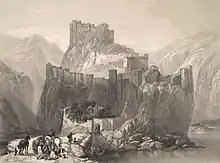 The Kangra fort is a historic fort located in the Kangra district of the Himachal Pradesh state, India. This fort is also known as 'Nagarkot' and 'Kot Kangra'.[1] This fort stands on a hillock between two rivers (Manjhi and Banganga), among the foothills of the Dhauladhar range. This fort is the largest in the Indian Himalayas, and is under the protection of the Archeological Survey of India.[2][3]