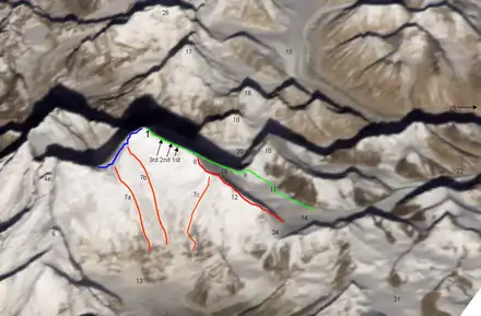 The Kangshung Face (Chinese: 康雄壁) or East Face[1] is the eastern-facing side of Mount Everest, one of the Tibetan sides of the mountain. It is 3,350 metres (11,000 ft) from its base on the Kangshung Glacier to the summit.[2] It is a broad face, topped on the right (when seen from below) by the upper Northeast Ridge, and on the left by the Southeast Ridge and the South Col. Most of the upper part of the face is composed of hanging glaciers, while the lower part consists of steep rock buttresses with couloirs between them. The steep southern third of the Kangshung Face also comprises the Northeastern Face of Lhotse; this section may be considered a separate face altogether following the division of the South "Neverest" Buttress up to the South Col. It is considered to be a dangerous route of ascent, compared to the standard North Col and South Col routes, and it is the most remote face of the mountain, with a longer approach.