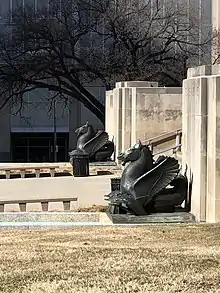 To the south of the building are fountains with two ornamental sea horses, dolphins, and seashells. City employees named the sea horses on the west side "Lug" and those on the east side "Cut" after the fountain's dedication. They were named for lugs of the political machine and cuts in pay for city workers in the 1930s. A statue of Abraham Lincoln and his son Tad was sculpted by Lorenzo Ghiglieri.
