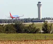 The airport covers 10,680 acres (4,320 ha) and has three runways.[2][3] The airport has always been a civilian airport and has never been assigned an Air National Guard unit. Since the 2020 pandemic shutdown, the number of peak-day scheduled aircraft departures has been steadily recovering. As of October 2022, there were 303 daily arrivals and departures.[4] Nonstop service was offered to 47 airports, including Cancun and Toronto.