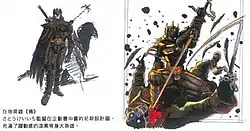 Mikura (御座) are yōkai who became Eko's minions and replaced their bodies with machinery. Ibira and Sato chose them to be villains, linking the act of the Karas as agents of the city killing these folklore creatures to traditional Japanese exorcism.[4] The chimera-like Nue, however, is a tragic anti-hero who learned of Eko's plans and turned against him.[18] Sato thought up the cybernetic angle to surprise the Japanese who perceive immaterial yōkai to lack physical threat.[4] Creature designer Kenji Andō adapted the yōkai designs from artist Toriyama Sekien's illustrated folklore books, Gazu Hyakki Yakō. The few yōkai with prominent roles in the show underwent greater changes. Andō pictured mikuras as direct cybernetic versions of Toriyama's portrayals, and made Suiko the Kappa and Nue look like robotic versions of their illustrated forms. Sato, however, was dissatisfied with two of Andō's designs, and redesigned them based on the concept behind the yōkai instead of on their appearance. The ghostly head in a flaming wheel, Wanyūdō became a heavily armed skull-on-wheels; and the bull-headed spider, Ushi-oni became a big-mouth, bug-eye, hungry-for-humans predator.[26]