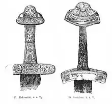 Drawing of Karelian Iron Age sword hilts by Theodor Schwindt made in 1893, which he had excavated earlier in Käkisalmi