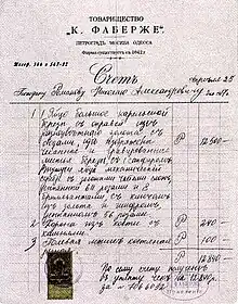 The Birch Egg was created in 1917, and was due to be completed and delivered to the Tsar that Easter, as a present for his mother, the Empress Maria Feodorovna. Before the egg was delivered however, the February Revolution took place and Nicholas II was forced to abdicate on March 15.[1] On April 25, Fabergé sent the Tsar an invoice for the egg, addressing Nicholas II not as "Tsar of all the Russians" but as "Mr. Romanov, Nikolai Aleksandrovich".[2][1] Nicholas paid 12,500 rubles and the egg was sent to Grand Duke Michael Alexandrovich at his palace, for presentation to the Empress, but the Duke fled before it arrived. The egg remained in the palace until it was looted in the wake of the October Revolution later that year.[1]