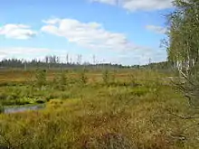 The isthmus is mostly covered by coniferous forests formed by Scots pine (Pinus sylvestris) and Norway spruce (Picea abies), with numerous lakes (e.g. Lake Sukhodolskoye and Lake Glubokoye) as well as small grass, fen and Sphagnum raised bogs. Forests cover approximately 11.700 km of the isthmus, more than three-fourths of its total square. Swampy areas occupy on average 5.5 percent of the territory. In the large contiguous area along the shore of Lake Ladoga in Vsevolozhsky District, in the southeastern part of the isthmus, bogs occur much more frequently than in other parts. The same was once true of the lowland along the Neva River, which has been drained.[4] The soil is predominantly podsol, which contains massive boulders, especially in the north and northwest, where large granite rocky outcrops occur.