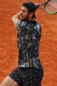 Karen Abgarovich Khachanov (Каре́н Абга́рович Хача́нов; born 21 May 1996) is a Russian-Armenian professional tennis player. Khachanov has won five ATP Tour singles titles, including a Masters 1000 title at the 2018 Paris Masters, has claimed an Olympic silver medal at the 2020 Tokyo Olympics, and has reached two Major semifinals at the 2022 US Open and 2023 Australian Open. He has also won one doubles Masters 1000 title at the 2023 Madrid Open partnering Andrey Rublev. He achieved his career-high singles ranking of world No. 8 on 15 July 2019.