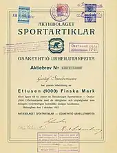 The Karhu brand featured prominently at the 1920 Antwerp Olympic Games, where Finnish athletes took all three medals in javelin using Karhu javelins,[4] and the "Flying Finns" took five gold medals on the track wearing Karhu spikes. Four years later, at the 1924 Summer Olympics in Paris, Paavo Nurmi won five gold medals in track events "wearing a conspicuous pair of white Karhu running spikes".[4]