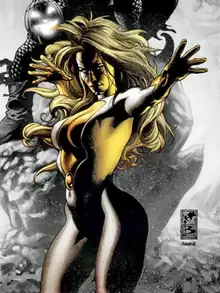 Egghead recruited her for the third Masters of Evil and she fought the Avengers.[26] However, her tenure was short-lived as she surrendered after the Masters of Evil's defeat.[26] It wasn't long before she broke out of confinement at Project: Pegasus with Blackout, the Rhino and Electro, battling the Avengers and escaping into the Darkforce dimension with Blackout.[27] She traveled to the Moon in search for more moon stone fragments, where she battled Dazzler and the Inhumans, and was then returned to Pegasus.[28]