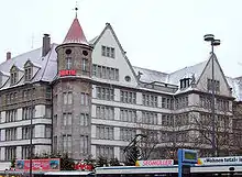 The traditional, historically protected department store was built between 1904 and 1905 according to designs by the Munich architect Max Littmann for the department store chain Hermann Tietz,[2] opposite the Hauptbahnhof, and opened on 14 March 1905. In the design of the building, Littmann used elements of the German Renaissance, following the historicizing taste of the time. The former department store Tietz is a five-storey hipped roof construction with protrusions, stair towers, gables and dormers. It was built in a skeletal steel construction with reduced historicizing façade structures, partly with muschelkalk. The sculptural façade decoration is by Julius Seidler, Jakob Bradl and Fidel Enderle.